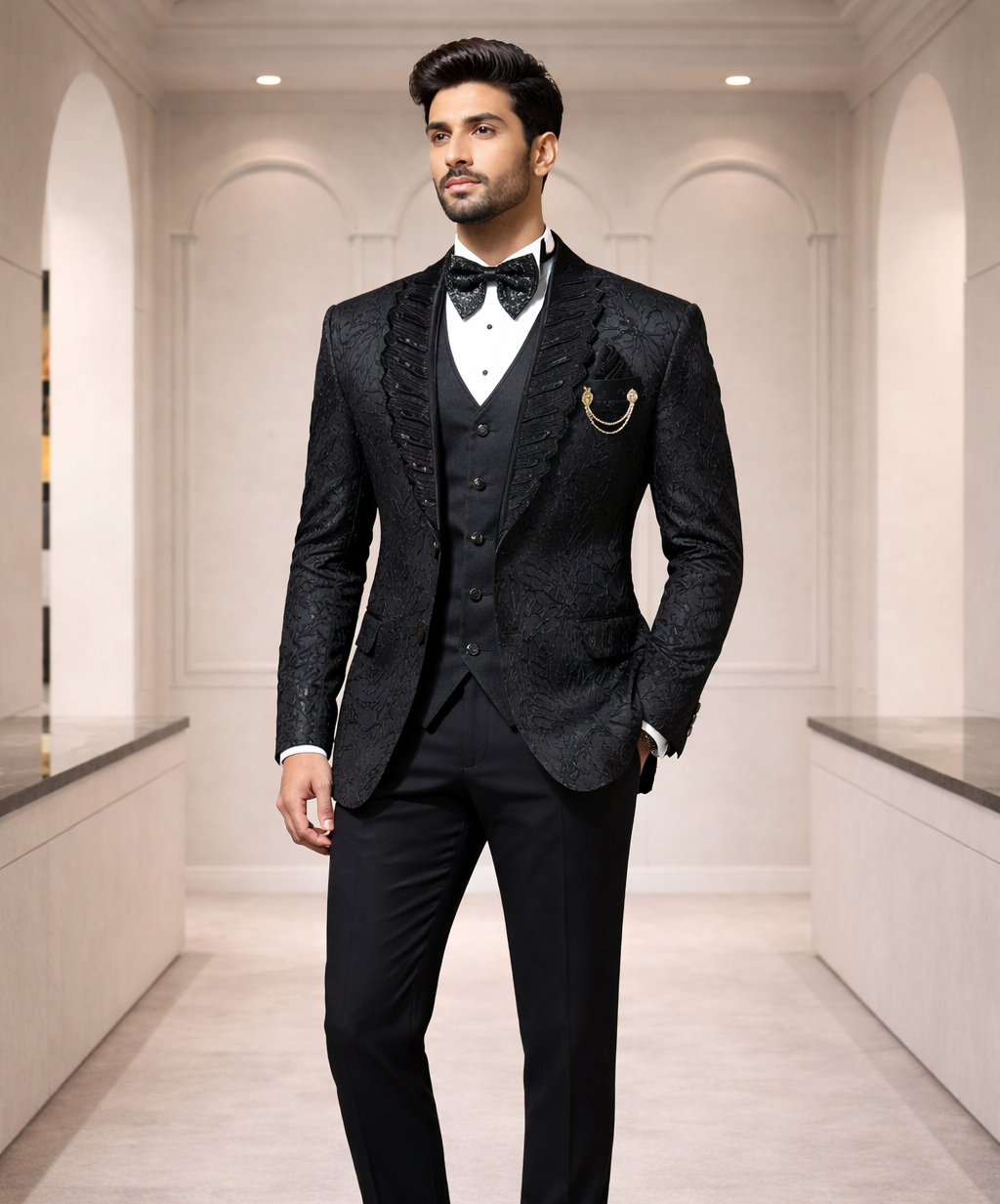 It is a luxury formal evening ensemble that blends classic black-tie tailoring with ornate Indian-inspired detailing. The blazer is crafted in deep midnight black fabric with an all-over tonal floral jacquard/embroidered texture, giving the surface a rich, dimensional look that subtly reflects light. The embroidery is elegant rather than flashy, creating a refined sheen that feels premium and couture.